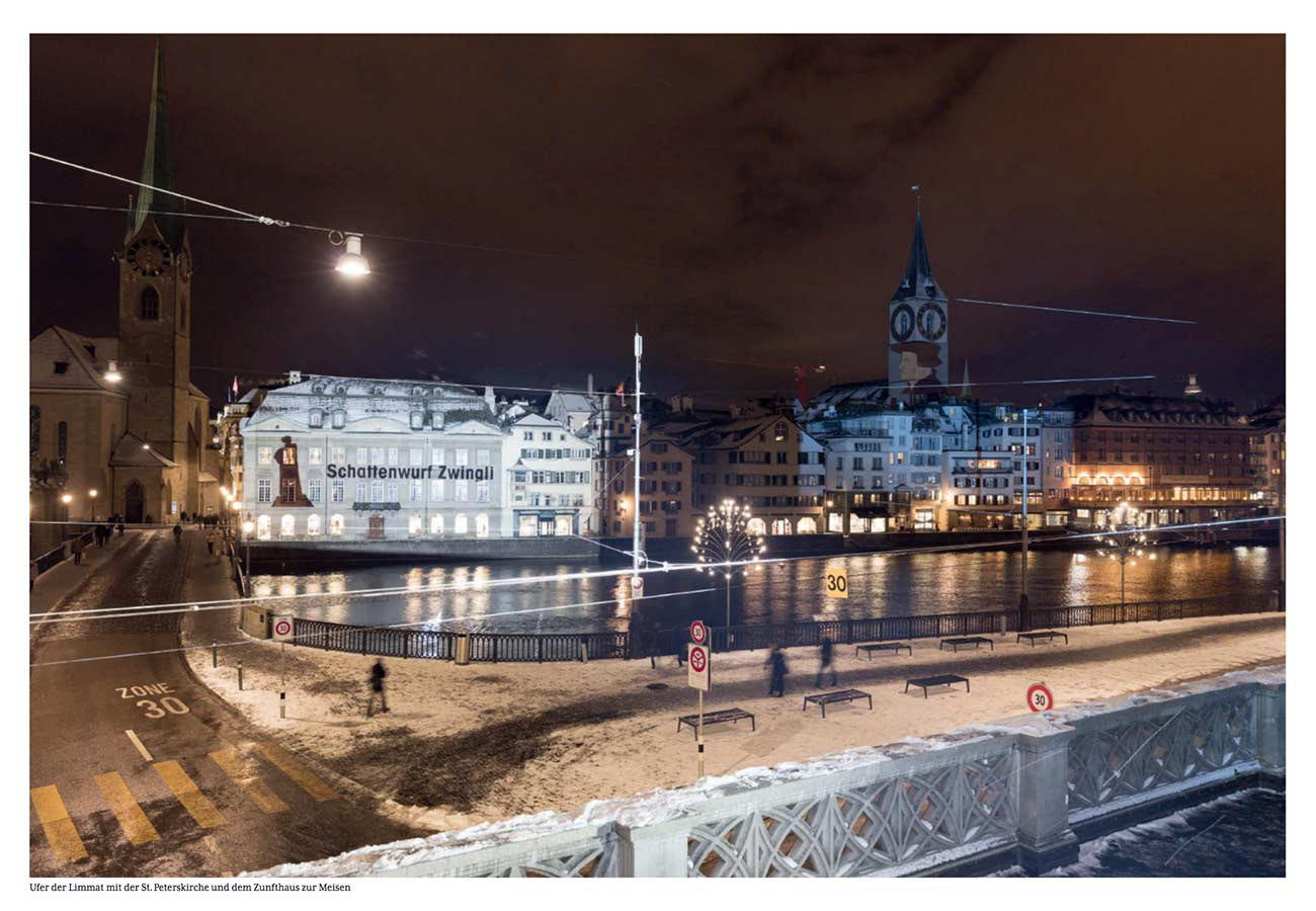 «Schattenwurf Zwingli» ist Kunst, Botschaft und Vision. Mit Lichtinstallationen gelang es im Reformationsjahr 2017, aussergewöhnliche Lichtspuren auf der biografischen Achse des Reformators Ulrich Zwingli in den öffentlichen Raum zu zeichnen. Monatliche Botschaften zu ausgewählten Themen wurden kontrovers und vor einem breiten Publikum debattiert genauso wie vor 500 Jahren im Chor des Grossmünsters bei der Übertragung der Bibel ins Deutsche. Mit der Projektion der Botschaften Zwinglis wurde die Vision einer gesellschaftsverändernden Wirkung von Kirche und Glaube weitherum hör- und sichtbar. Zurück bleibt dieses reich bebilderte Buch. Es lädt ein, über die Parallelen der gesellschaftlichen Veränderungen von damals und heute nachzudenken und darüber, was seit 500 Jahren bis heute Halt und Orientierung bietet.