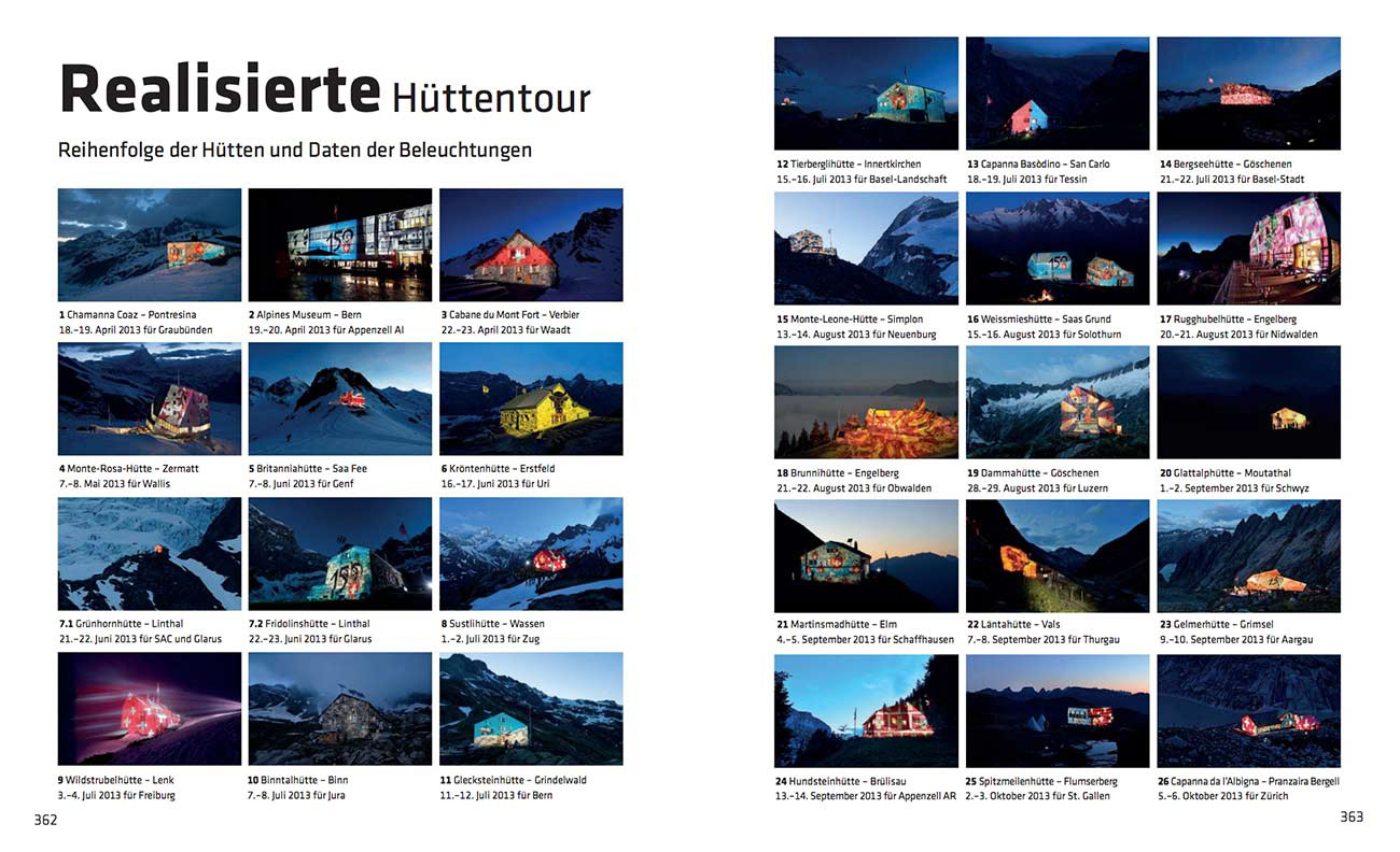 Zum 150-Jahr-Jubiläum des Schweizerischen Alpen-Clubs beleuchtete der Lichtkünstler Gerry Hofstetter 26 SAC-Hütten und setzte ihnen ein flüchtiges Denkmal. Auf Touren von April bis Oktober 2013 in den Schweizer Bergen zeigte er mit seinem Light Art Team auf, wie man natur- und umweltschonend in eine SAC-Hütte gelangt. Sie transportierten das benötigte Projektionsmaterial – bis zu 55 Kilogramm – mit umgebauten Rucksäcken zu Fuss, auf Skiern und mit Schlitten im Schlepptau oder mit Luftseilbahnen, Pferden und Lasteseln. Begleitet wurde das Team von Freiwilligen, Freunden, Kunden, einem Fotografen- und Filmteam sowie diversen Medien. Das Buch zeigt das Making-of dieser spektakulären Kunstaktion und erzählt die Geschichten dahinter: 26 Erlebnisse mit Menschen und Natur, Kunst und Kultur, durchgeführt unter grosser körperlicher Anstrengung.